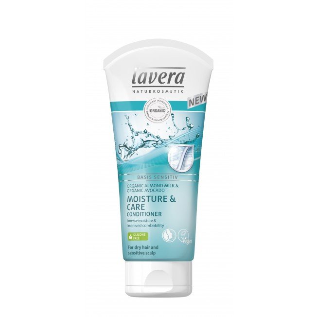 Lavera Basis Sensitiv Moisture&Care Hoitoaine kosteuttaa hellävaraisesti hiuksia ja päänahkaa sen sisältämän luomumantelimaidon ja –avokadon ansiosta.