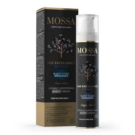 Mossan Age Excellence -linja on kehitetty 35+ iholle, ja tuotteissa on vahva anti age -vaikutus. Linjan Intensive Wrinkle Smoothing Night Cream stimuloi kollageenisynteesiä ruusununmarjan pro-retinolin avulla yöunien aikana. Silloin iho korja itseään ja on vastaanottavaisimmillaan ravintoaineille. Siksi yövoiteen täytyy olla ravitsevampi, kuin päivävoiteen, jolloin iho kaipaa enemmän suojaa, kuin ravinteita.